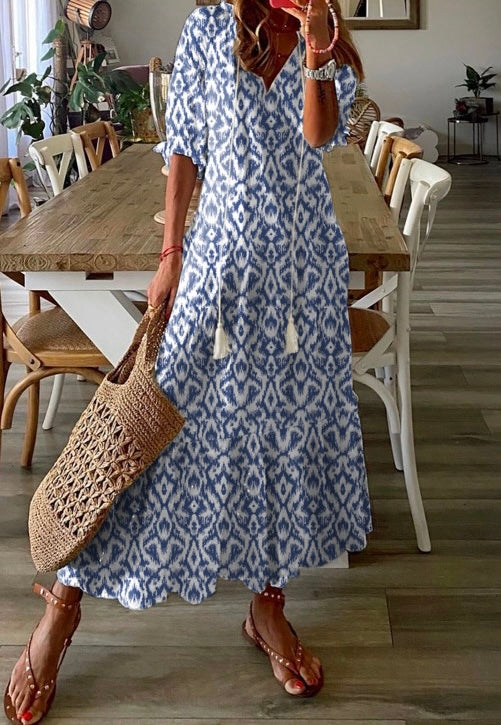 Sky Blue V-neck geometric pattern dress